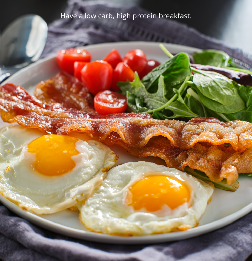 Next, let’s talk about your first meal of the day. Did you know that your body is naturally more insulin-sensitive in the morning? That means having a nutritious breakfast within an hour of waking can really help keep your blood sugar levels stable. So what should your breakfast look like? Lowering your carbohydrate intake is crucial for managing insulin resistance. Carbs, especially refined ones like sugar, bread, and pasta, cause spikes in blood sugar levels. When your blood sugar rises, your pancreas releases insulin to help your cells absorb the sugar. Over time, high insulin levels can lead to insulin resistance. So instead of eating a typical breakfast with fruit juice, cereal, muffins, or pancakes, which will send you on a glucose rollercoaster, you are going to make sure your breakfast is FOCUSED around proteins and healthy fats to keep you energized and avoid those glucose spikes.